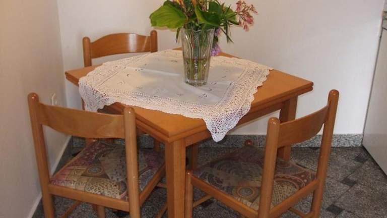 Die Ferienwohnung umfasst eine voll ausgestattete Küche mit Kühlschrank und Kaffeemaschine, was die Selbstversorgung ermöglicht. Grillmöglichkeiten stehen ebenfalls zur Verfügung.
