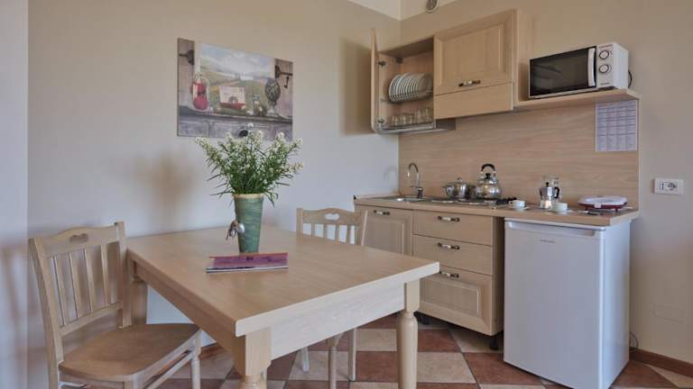Die Ferienwohnung ist mit einem TV, einer Küchenzeile, einem Kühlschrank und einer Herdplatte ausgestattet.