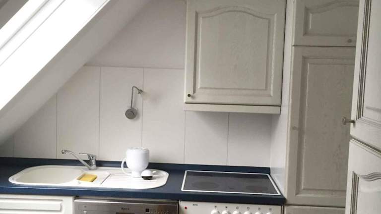 Die Ferienwohnung besitzt eine voll ausgestattete Küchenzeile, in der die Gäste ihre Mahlzeiten selbst zubereiten können. Eine detaillierte Buchung wird mit Informationen zur Schlüsselübergabe und Zahlungsdetails bereitgestellt.