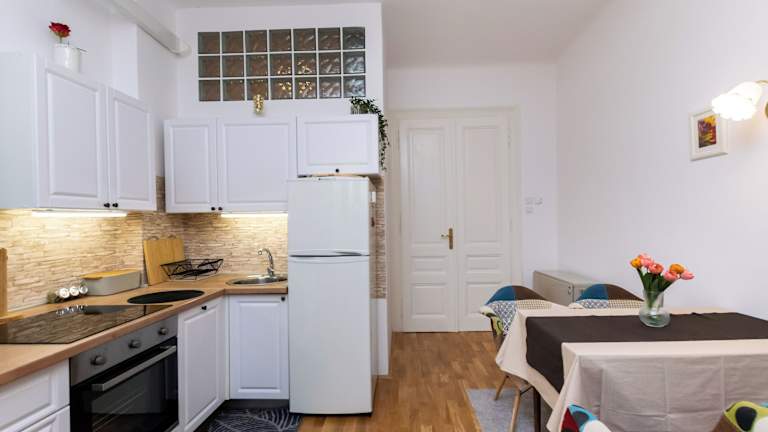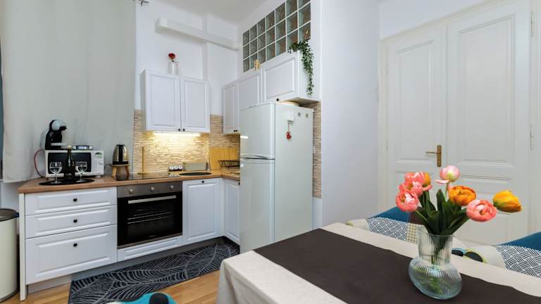 Die Unterkunft umfasst ein Schlafzimmer, ein Wohnzimmer, eine voll ausgestattete Küche mit Kühlschrank und Kaffeemaschine sowie ein Badezimmer mit Dusche und Haartrockner. Handtücher und Bettwäsche werden bereitgestellt.