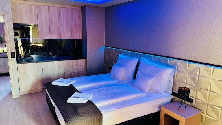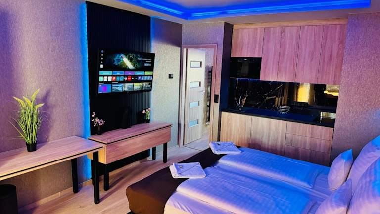 Das Royal Apartments Hotel Kecskemét bietet komfortable und klimatisierte Apartments und Zimmer in günstiger Lage, nur 1 km vom Stadtzentrum entfernt. Mit kostenfreiem WLAN und Parkplätzen im Innenhof ist dieses Hotel eine ideale Wahl für Ihren Aufenthalt. Genießen Sie die voll ausgestattete Küche in jedem Apartment und Zimmer sowie den kostenfreien Grillbereich im Garten. Das Frühstück kann auf Anfrage in einem nahegelegenen Restaurant serviert werden. Entdecken Sie die Sehenswürdigkeiten der Stadt, wie den Cifra-Palast und das Theater Katona József, die nur einen 20-minütigen Spaziergang entfernt sind.