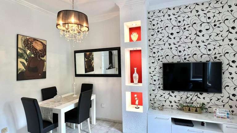 Die Ferienwohnung umfasst 1 Schlafzimmer, 1 Badezimmer, Bettwäsche, Handtücher, einen Flachbild-TV mit Kabelkanälen, einen Essbereich, eine voll ausgestattete Küche und eine Terrasse mit Stadtblick.