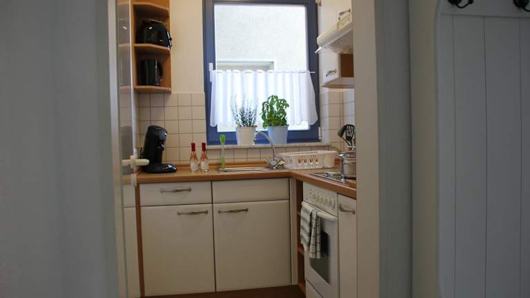 In jeder Wohneinheit befindet sich eine gut ausgestattete Küche mit Kühlschrank, Herdplatte, Toaster, Kaffeemaschine und Wasserkocher, die selbständige Verpflegung ermöglicht.