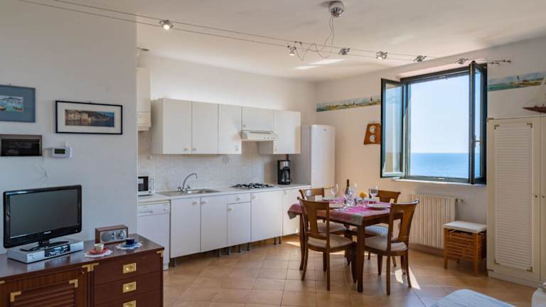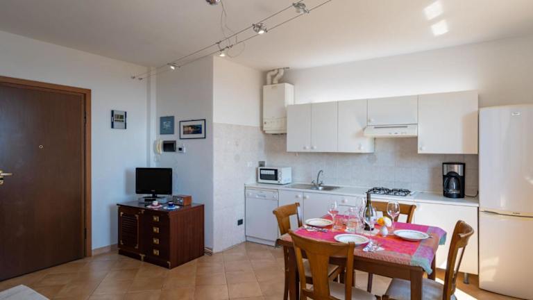 Die Ferienwohnung umfasst ein Schlafzimmer, ein Wohnzimmer sowie eine voll ausgestattete Küche, die mit einem Kühlschrank und einer Kaffeemaschine ausgestattet ist. Des Weiteren verfügt die Wohnung über ein Badezimmer mit Bidet und Dusche sowie einen TV.