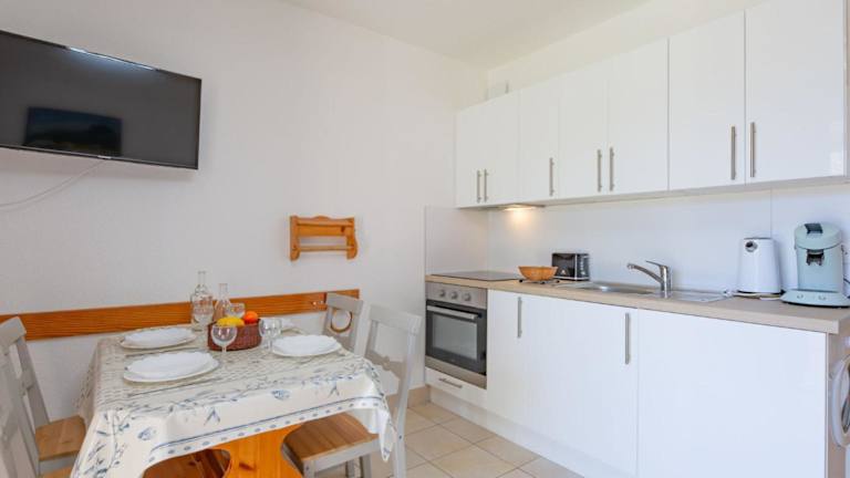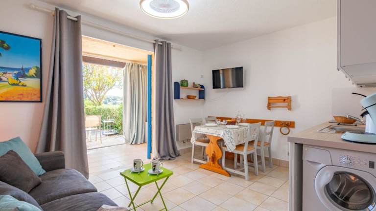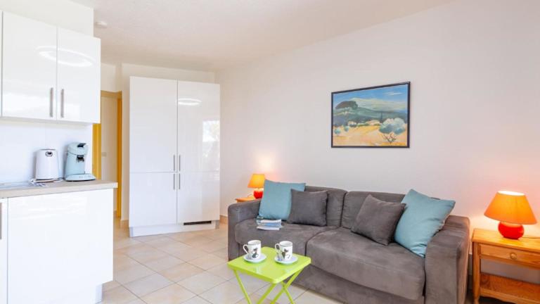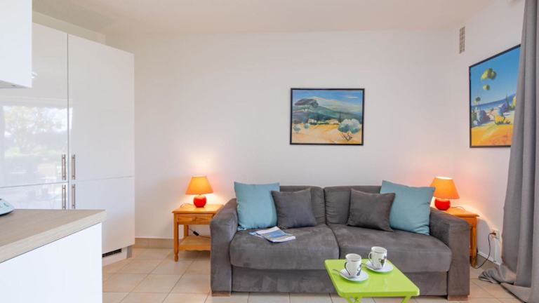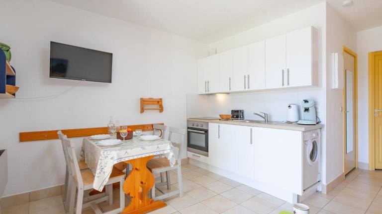 Die Ferienwohnung umfasst 1 Schlafzimmer und ein Wohnzimmer mit TV. Eine gut ausgestattete Küchenzeile mit Kühlschrank und Ofen ist ebenfalls vorhanden. Zur Ausstattung gehört zudem ein Badezimmer mit Badewanne oder Dusche sowie eine Terrasse mit Meerblick. Handtücher und Bettwäsche können gegen Gebühr oder bei eigener Mitnahme bereitgestellt werden.