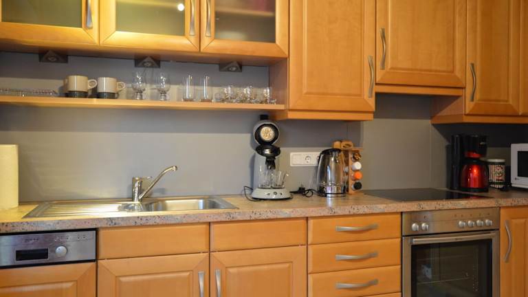 Die Küche ist mit einem Kühlschrank, einem Geschirrspüler, einer Mikrowelle und einem Wasserkocher ausgestattet, was Selbstversorgermöglichkeiten bietet.