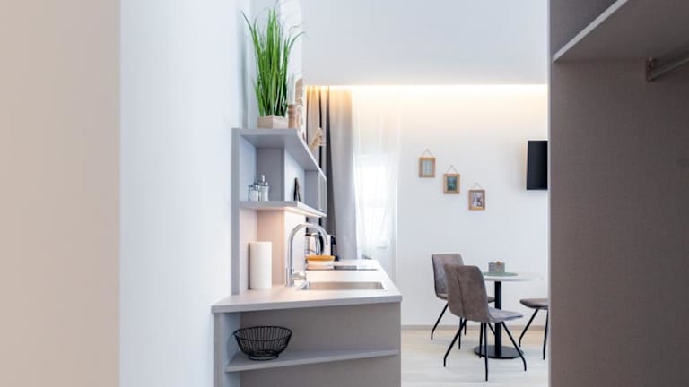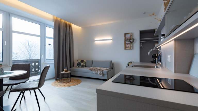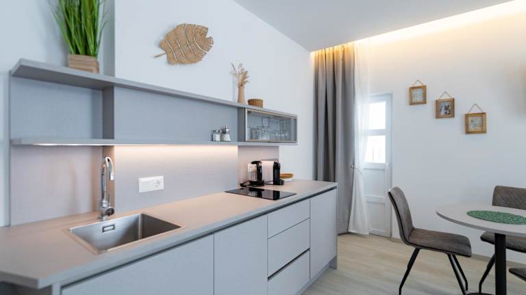 Jede Unterkunft verfügt über eine voll ausgestattete Küche mit Esstisch, Kühlschrank, Geschirrspüler, Herdplatte und Kaffeemaschine, wodurch Selbstverpflegung möglich ist.