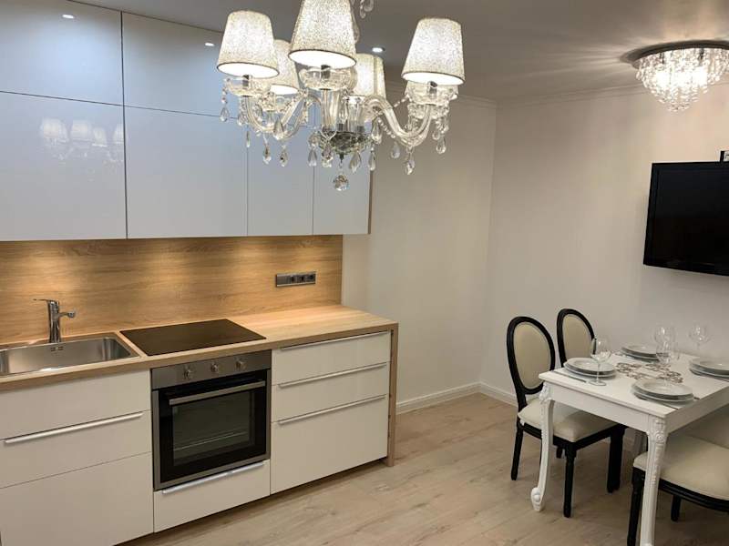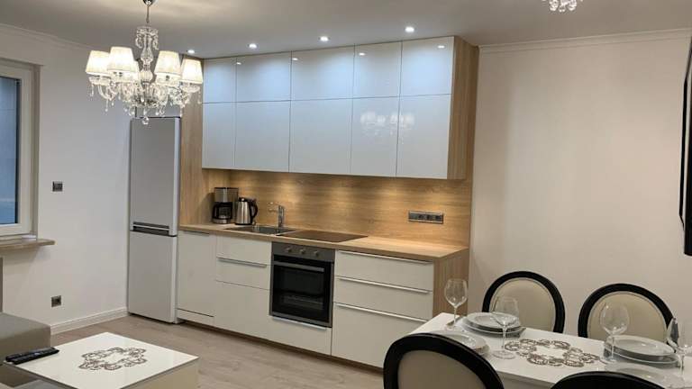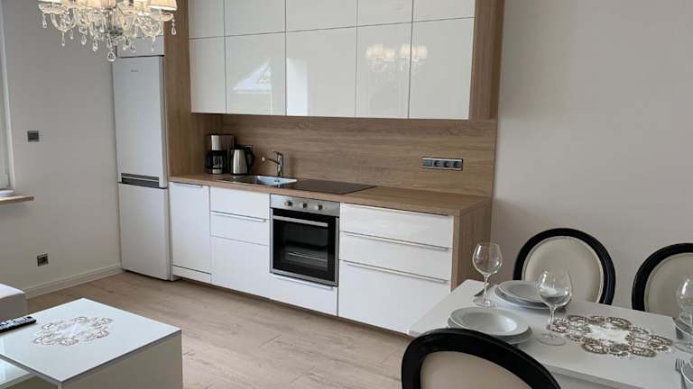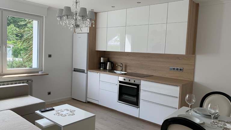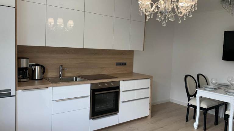 Die Ferienwohnung verfügt über eine voll ausgestattete Küchenzeile, die mit einem Kühlschrank und einer Kaffeemaschine ausgestattet ist, sodass die Gäste ihre eigenen Mahlzeiten zubereiten können.
