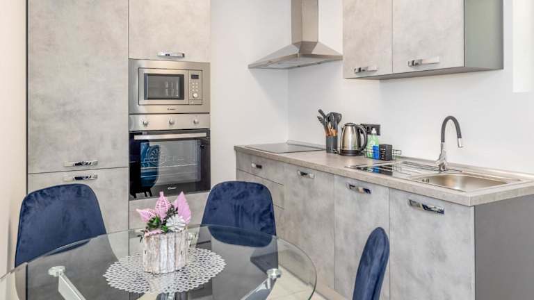 Das Apartment umfasst ein Schlafzimmer sowie ein Wohnzimmer und ist mit einem TV ausgestattet. Die gut ausgestattete Küche verfügt über einen Kühlschrank und einen Geschirrspüler. Darüber hinaus sind ein Badezimmer mit Dusche und eine Terrasse vorhanden.