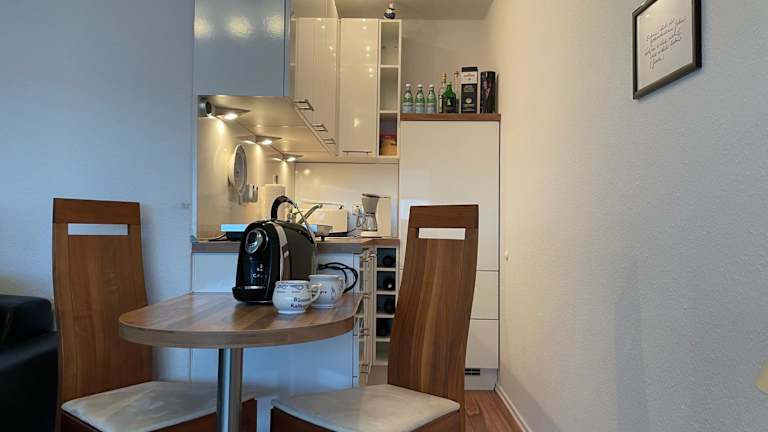 Die Küchenzeile der Unterkunft ist ausgestattet mit einem Kühlschrank, einem Ofen, einer Mikrowelle, einer Kaffeemaschine und einem Wasserkocher, was die Möglichkeit zur Selbstverpflegung bietet.