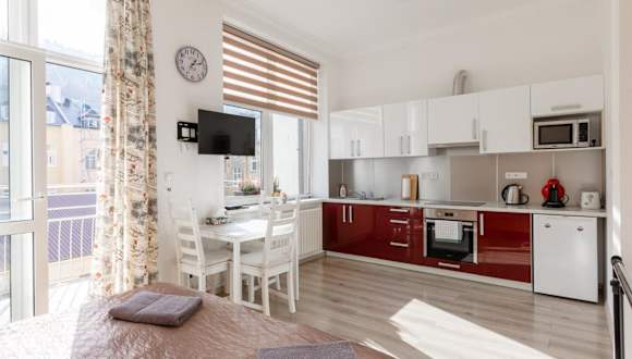 Die Unterkunft befindet sich in Karlsbad, etwa 1,9 km von der Marktkolonnade und der Heißen Quelle entfernt. In der Umgebung bestehen zahlreiche Möglichkeiten zum Wandern und Skifahren.