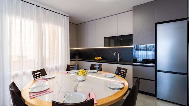 Die Ferienwohnung verfügt über 3 Schlafzimmer, ein Wohnzimmer sowie eine voll ausgestattete Küche mit Kühlschrank und Kaffeemaschine. Es gibt 4 Badezimmer, die jeweils mit Dusche und Badewanne ausgestattet sind. Zur Unterhaltung bieten die Zimmer einen TV, einen DVD-Player und einen CD-Player.