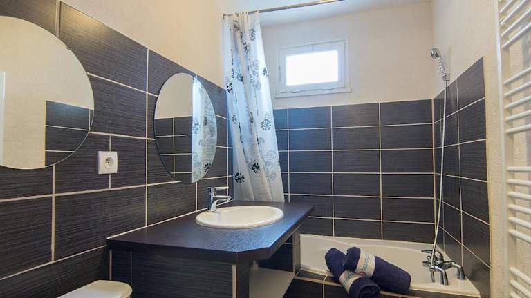 Die Wohnung besteht aus einem Schlafzimmer, einem Wohnzimmer sowie einem Badezimmer mit Badewanne. Die Ausstattung umfasst zudem einen Flachbild-TV.