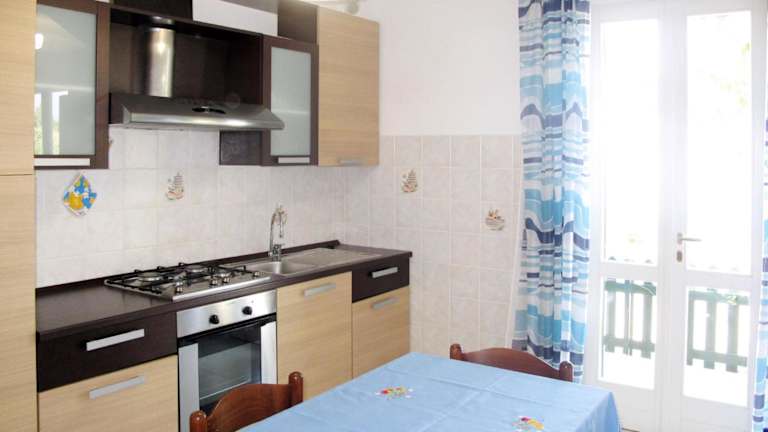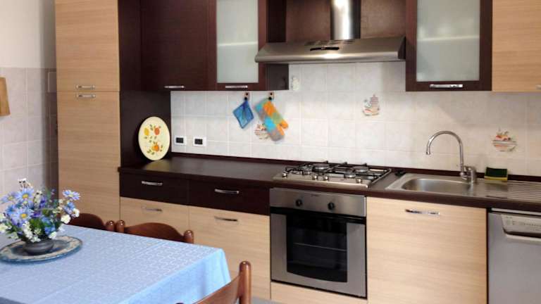 Die Ferienwohnung hat eine gut ausgestattete Küche, die eine Ausstattung mit Kühlschrank und Geschirrspüler umfasst.