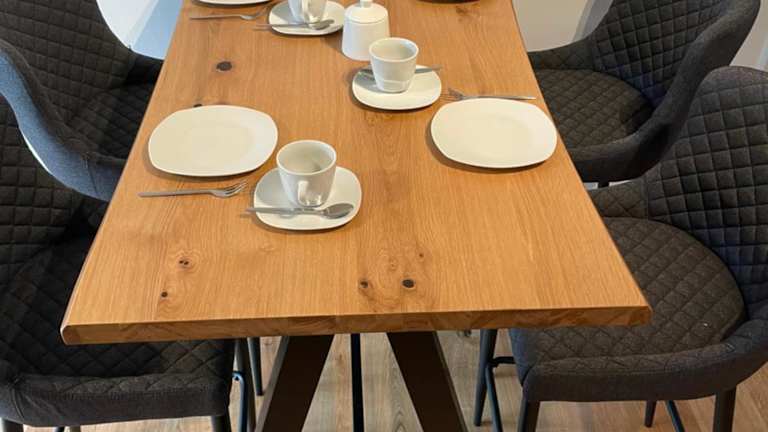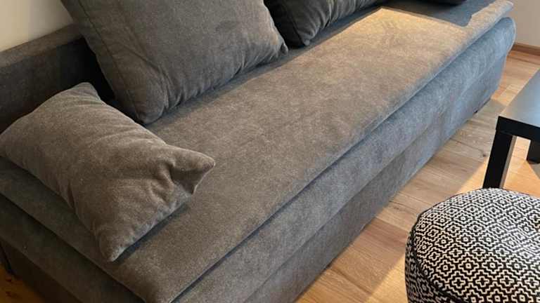Die Küchenzeile ist ausgestattet mit einem Kühlschrank, einem Geschirrspüler, einem Ofen, einer Herdplatte, einem Toaster, einer Kaffeemaschine und einem Wasserkocher. Eine Terrasse ist ebenfalls vorhanden.