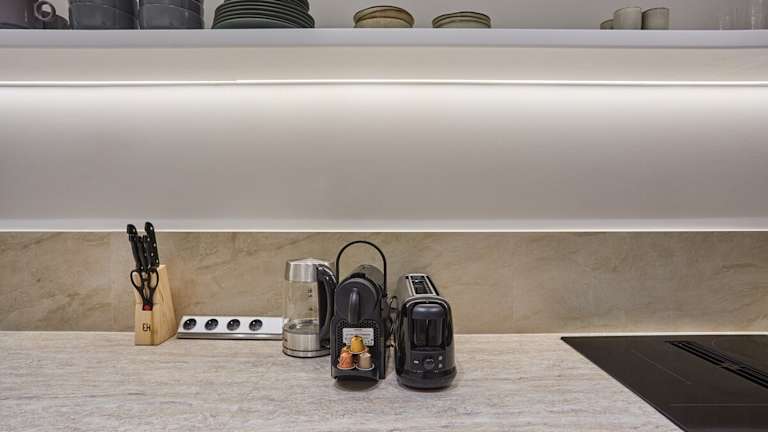 Die voll ausgestattete Küche beinhaltet einen Kühlschrank und eine Kaffeemaschine, jedoch sind keine separaten Verpflegungsmöglichkeiten erwähnt.