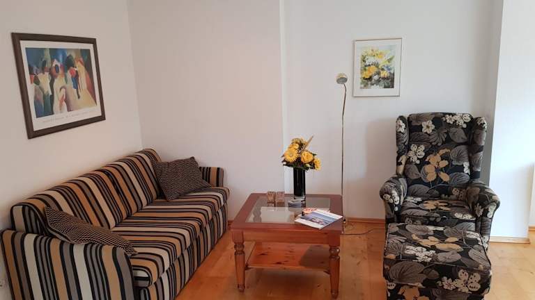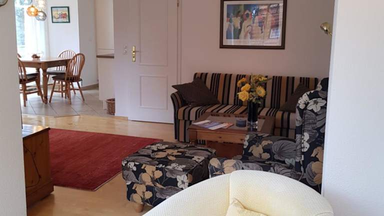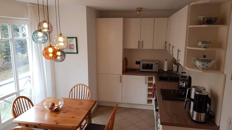 Die Ferienwohnung besteht aus einem Schlafzimmer, einem Wohnzimmer und einer voll ausgestatteten Küche, die mit einem Kühlschrank und einer Kaffeemaschine ausgestattet ist. Ein Badezimmer mit Dusche und Haartrockner gehört ebenfalls zur Ausstattung. Handtücher und Bettwäsche werden bereitgestellt.