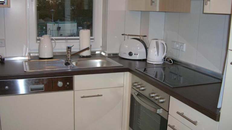 Das Apartment umfasst zwei Schlafzimmer sowie eine Küche, die mit einem Kühlschrank, einem Geschirrspüler und einer Kaffeemaschine ausgestattet ist. Für zusätzlichen Komfort können Handtücher und Bettwäsche gegen Aufpreis bereitgestellt werden.
