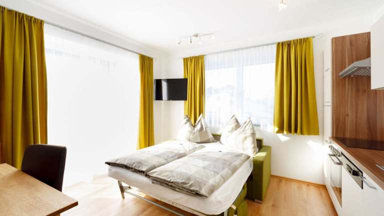 Das Apartment verfügt über einen Balkon mit Bergblick und umfasst 1 Schlafzimmer, ein Wohnzimmer, einen TV sowie eine gut ausgestattete Küche mit Kühlschrank und Geschirrspüler. Das Badezimmer ist mit einer Dusche ausgestattet.