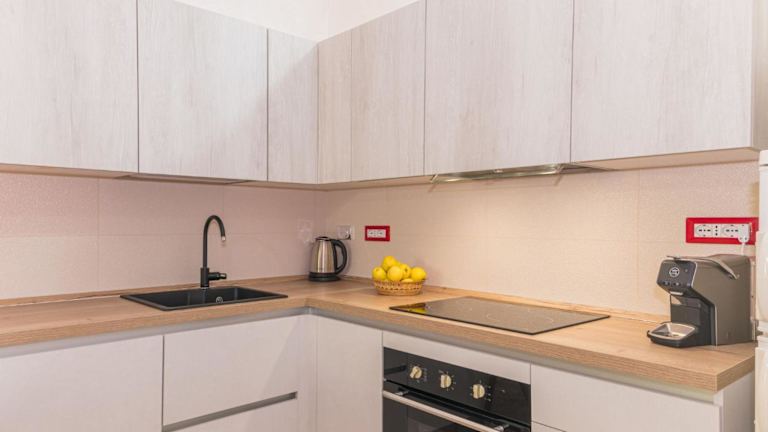 Die Küche ist mit einem Kühlschrank, einem Geschirrspüler und einem Ofen ausgestattet, sodass Selbstversorger optimal versorgt sind. Ein Essbereich ist ebenfalls vorhanden.