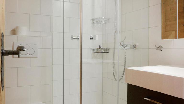Die Ferienwohnung umfasst eine gut ausgestattete Küche mit Kühlschrank, Geschirrspüler und Ofen sowie ein Badezimmer mit Dusche und Haartrockner. Der Balkon bietet einen Blick auf die Berge.