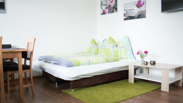 Die Ferienwohnung umfasst ein Schlafzimmer, ein Wohnzimmer mit einem Flachbild-TV, eine gut ausgestattete Küche mit Kühlschrank und Geschirrspüler sowie ein Badezimmer mit Dusche. Handtücher und Bettwäsche werden bereitgestellt.