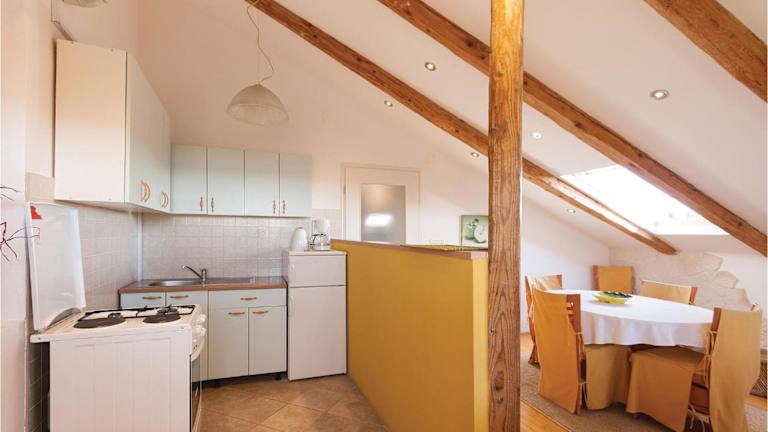 Die Ferienwohnung verfügt über eine voll ausgestattete Küche mit einem Kühlschrank und einer Kaffeemaschine.