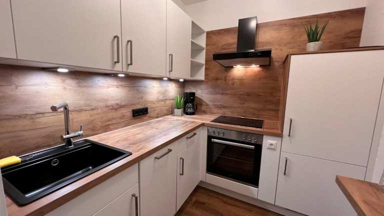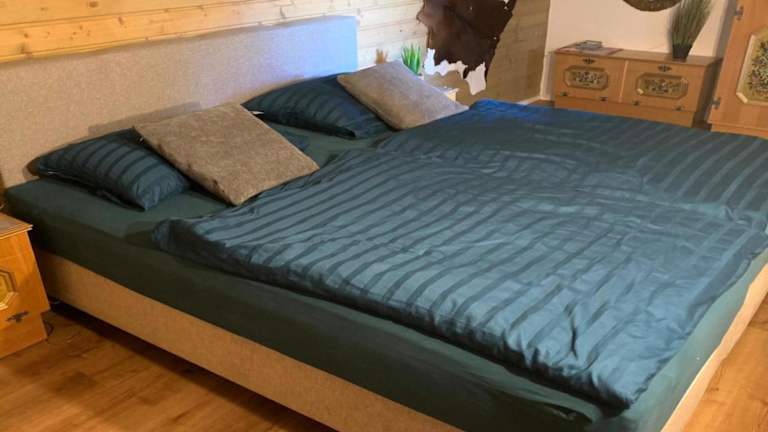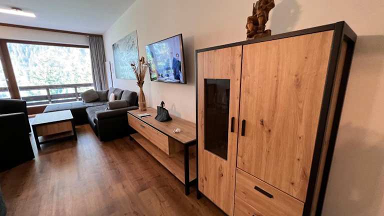 Die Ferienwohnung umfasst 2 Schlafzimmer, ein Wohnzimmer mit TV sowie eine gut ausgestattete Küche, die mit einem Kühlschrank und einem Geschirrspüler ausgestattet ist. Zudem steht ein Badezimmer mit Badewanne zur Verfügung. Ein Balkon mit Bergblick ergänzt die Ausstattung.