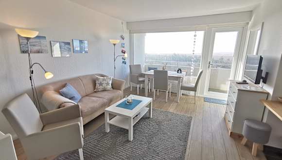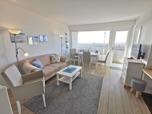 “Utkiek” – ist das plattdeutsche Wort für Ausguck – und die Aussicht ist wirklich atemberaubend! Genießen Sie von Ihrem Balkon aus das Wechselspiel der Farben des Meeres, den romantischen Sonnenuntergang über dem Strand oder die Lichter auf dem Wasser in der Nacht – bis zum Leuchtturm von Helgoland. In der “Parkwohnanlage Atlantic” schauen Sie aus dieser Wohnung im 9. Obergeschoss weit nach Süden über das Meer, den Strand und das Vorland. Das Apartment wurde von den neuen Besitzern grundlegend renoviert, liebevoll und hochwertig ausgestattet. Im Eingangsbereich gibt es einen kleinen Flur, daneben das moderne Duschbad mit WC. Ein breites Doppelbett und ein extra Bett in einem kleinen Schlafraum machen dieses Apartment ideal für die kleine Familie oder das anspruchsvolle Paar. Der große Wohn-Schlafraum ist hell und freundlich gestaltet und hat einen Esstisch direkt am Fenster und eine gemütliche Sitzgarnitur. Die Küche ist komplett ausgestattet, mit Spülmaschine und allem Komfort. Der traumhafte Blick läßt sich nicht nur vom Balkon aus genießen, sondern auch vom Esstisch aus – dort steht auch ein Fernglas zu Ihrer Verfügung. Das Apartment “Utkiek” ist mit dem Fahrstuhl gut erreichbar. In der Anlage sind Münz-Waschmaschine und -Trockner und Tischtennisräume. Die Tennisplätze vor dem Haus können kostenlos benutzt werden, ein schöner großer Spielplatz ist auch vor dem Haus. Bettwäsche und Handtücher sind wie immer bei Appartements Süderdün im Preis enthalten, ebenso die Endreinigung. Nichtraucher, keine Haustiere. Ausstattung: Grundfläche ca. 47 qm im 9. Obergeschoss, Wohnschlafraum, Duschbad/WC und abgeteilte Küchenzeile. Kaffeemaschine, Toaster, Wasserkocher, Flachbild-TV (Kabel). WLAN kostenlos. Lage: St. Peter-Ording, Ortsteil Bad, Alter Badweg Nr. 11-18, Apartment Nr. 144, PKW-Stellplatz Nr. 76 (kostenlos).