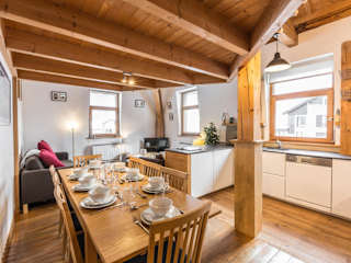 Die Ferienwohnung umfasst zwei Schlafzimmer, ein Wohnzimmer sowie eine voll ausgestattete Küche, die mit einem Kühlschrank und einer Kaffeemaschine ausgestattet ist. Zu den Annehmlichkeiten gehören zwei Badezimmer mit Badewanne und Haartrockner. Handtücher und Bettwäsche werden bereitgestellt.