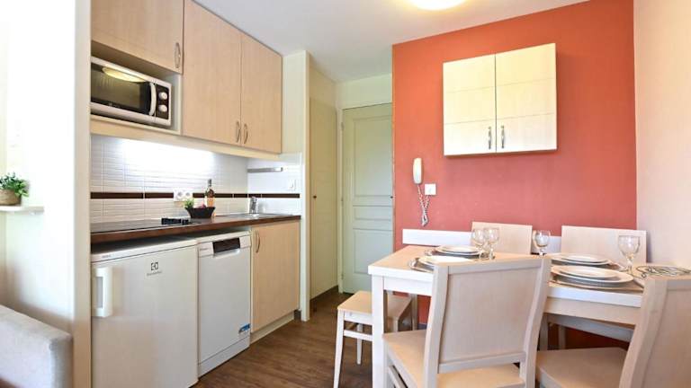 Das Apartment umfasst ein Schlafzimmer, ein Wohnzimmer sowie eine gut ausgestattete Küchenzeile mit Kühlschrank und Geschirrspüler. Zudem sind ein Badezimmer mit Badewanne oder Dusche und eine TV-Ausstattung vorhanden. Handtücher und Bettwäsche können gemietet werden, und das Apartment bietet einen Blick auf die Berge.