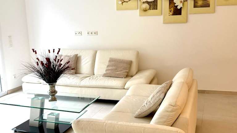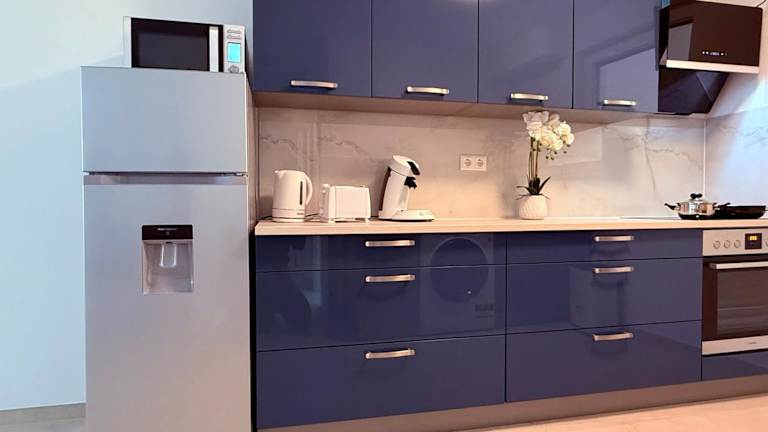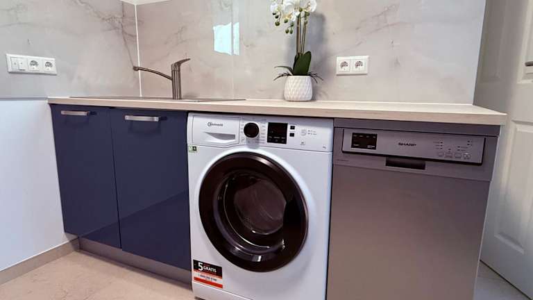 Die Ferienwohnung verfügt über drei Schlafzimmer und eine Küche, die mit einem Kühlschrank und einem Geschirrspüler ausgestattet ist. Es gibt zwei Badezimmer, die jeweils mit einer Dusche und einem Haartrockner ausgestattet sind. Zudem sind eine Waschmaschine sowie Handtücher und Bettwäsche vorhanden.