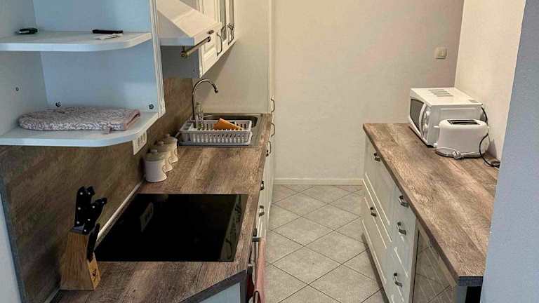 Die Ferienwohnung besteht aus zwei Schlafzimmern, einem Wohnzimmer und einer voll ausgestatteten Küche mit Kühlschrank und Kaffeemaschine. Zur Ausstattung gehört auch ein Badezimmer mit Dusche und Whirlpool. Handtücher und Bettwäsche werden bereitgestellt.