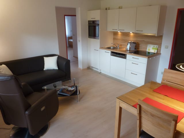 3-Zimmer-Wohnungen mit Wohnraum und zwei separaten Schlafzimmern, 2 Duschbäder, Küchenzeile im Wohnraum mit Induktionskochfeld (4 Kochstellen), Backofen, Geschirrspüler, Kühlschrank mit Gefrierfach, Kaffeemaschine, 50-Zoll-TV inkl. sky-TV, Balkon 2-Zimmer-Wohnungen mit Wohnraum und separatem Schlafzimmer, (Dusch)Bad, Küchenzeile im Wohnraum mit Induktionskochfeld (4 Kochstellen), Backofen, Geschirrspüler, Kühlschrank mit Gefrierfach, Kaffeemaschine, 50-Zoll-TV inkl. sky-TV, Balkon/Terrasse