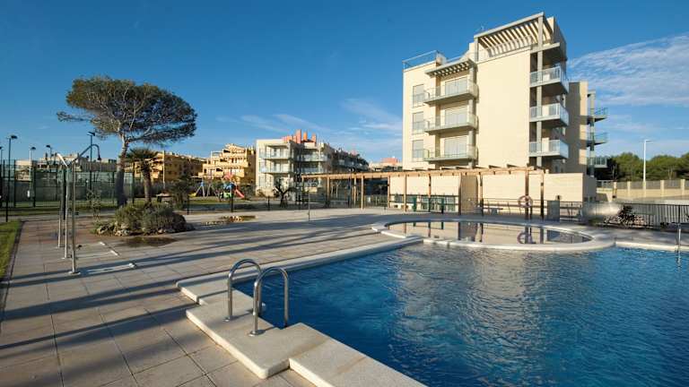 Verbringen Sie einen erholsamen Aufenthalt im modernen Hotel Apartamentos Alcocebre Suites 3000 direkt am Strand Playa del Moro. Dieser elegante Apartmentkomplex bietet gut ausgestattete Küchen, geräumige Terrassen und Flachbild-TVs in jedem Apartment. Genießen Sie die hervorragenden Einrichtungen wie den großen Außenpool, den ruhigen Gartenbereich und den kostenfreien Paddle-Tennisplatz. Die Lage des Hotels ist ideal für einen entspannten Strandurlaub an der Küste von Azahar.