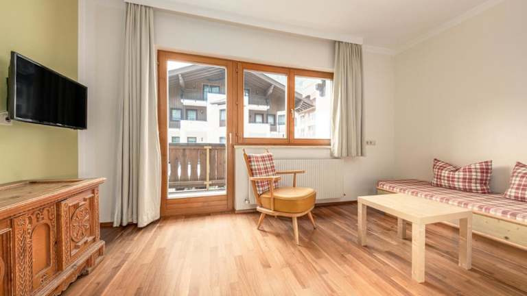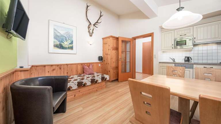 Die Apartments im Haus Alpina sind gemütlich eingerichtet und bieten einen wunderschönen Holzbalkon mit herrlichem Bergblick. Die Apartments verfügen über Holzfußböden, weiße Wände und eine offene Küche im Wohnzimmer. Die Küche ist mit einer Mikrowelle und einer Kaffeemaschine ausgestattet. Das Wohnzimmer verfügt über ein Schlafsofa und Kabel-TV. Das Schlafzimmer bietet direkten Zugang zum Balkon, der in den wärmeren Monaten mit Blumen geschmückt ist. Die Badezimmer sind mit einem Haartrockner, einer Dusche und einem Kosmetikspiegel ausgestattet.
