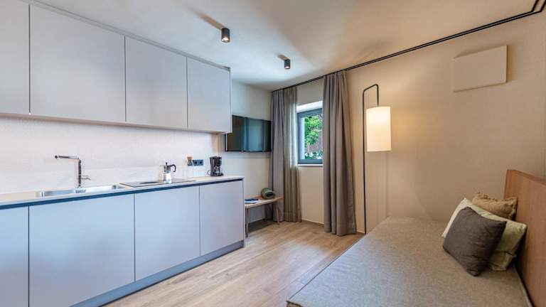 Die Apartments verfügen über einen Sitzbereich, einen Satelliten-TV, eine voll ausgestattete Küche mit Kühlschrank und Geschirrspüler sowie ein eigenes Badezimmer mit Bidet.