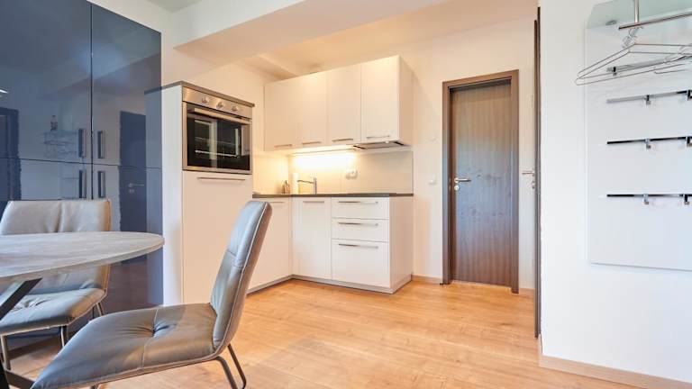 Jede Wohneinheit verfügt über eine voll ausgestattete Küche mit einem Esstisch, Kühlschrank, Geschirrspüler, Ofen, Kaffeemaschine und Wasserkocher, was eine unabhängige Verpflegung ermöglicht.