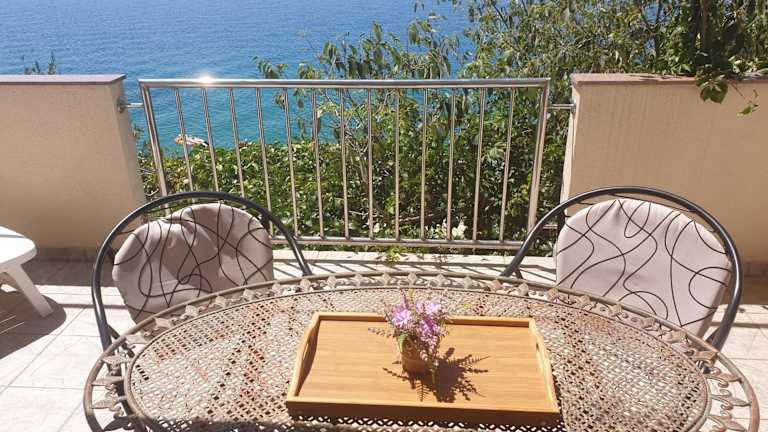 Die Unterkunft bietet Wohneinheiten mit kostenlosem WLAN, Klimaanlage, Garten und einem eigenen Strandbereich. Eine Terrasse mit Meerblick ist ebenfalls vorhanden. Die Mindestalter für den Check-in beträgt 18 Jahre. Haustiere sind auf Anfrage erlaubt.
