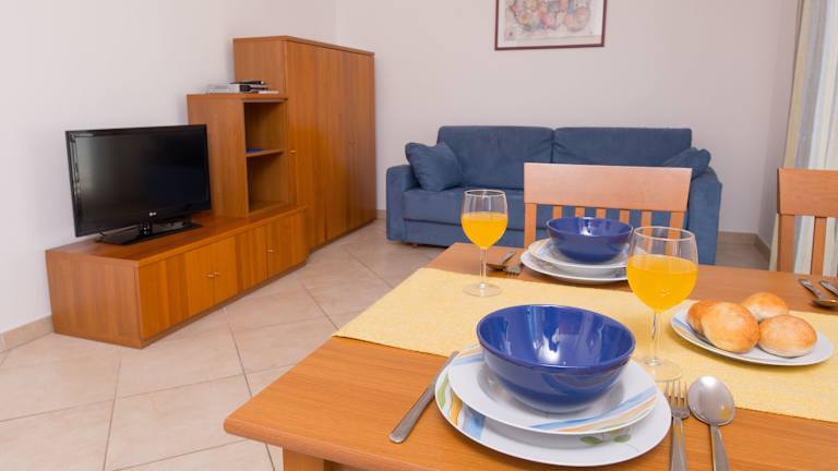 Die klimatisierten Apartments sind mit einem Essbereich und einem Sitzbereich ausgestattet, der einen Flachbild-Sat-TV umfasst. Einige Apartments bieten zusätzlich eine Terrasse oder einen Balkon mit Meerblick. Die Küchenzeilen sind mit einem Kühlschrank, einem Herd und einer Kaffeemaschine ausgestattet. Bettwäsche ist ebenfalls vorhanden.