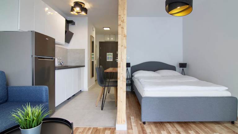 Die Apartments verfügen über einen Balkon mit Stadtblick. Zur Ausstattung gehören ein Sitzbereich, ein Flachbild-TV sowie eine voll ausgestattete Küchenzeile mit Kühlschrank und Herdplatte. Des Weiteren stehen ein eigenes Badezimmer mit Dusche und kostenlosen Pflegeprodukten zur Verfügung.