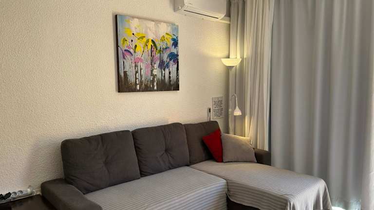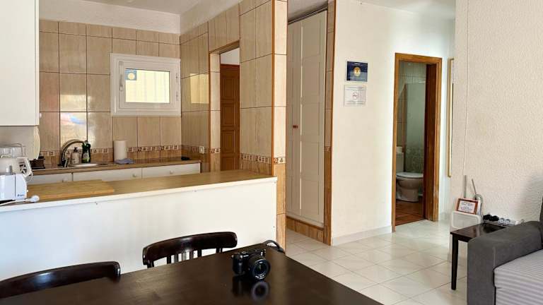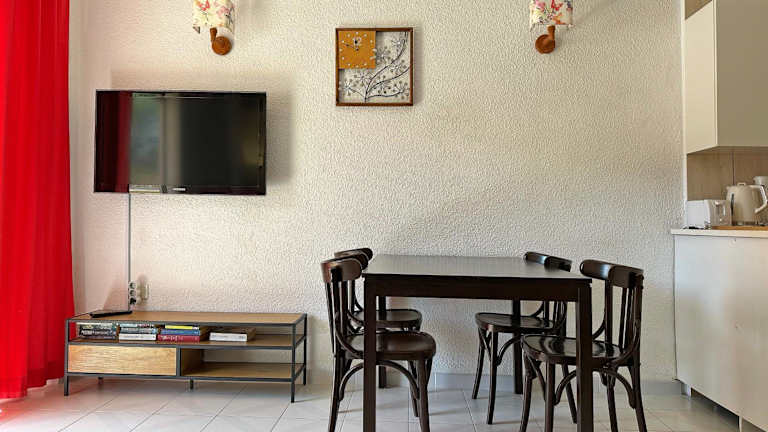 Die Ferienwohnung ist klimatisiert und besteht aus einem Schlafzimmer, einem Wohnzimmer und einer voll ausgestatteten Küche mit Kühlschrank und Kaffeemaschine. Das Badezimmer ist mit einem Bidet und einer Dusche ausgestattet. Handtücher und Bettwäsche werden bereitgestellt, und es gibt einen Balkon mit Gartenblick.
