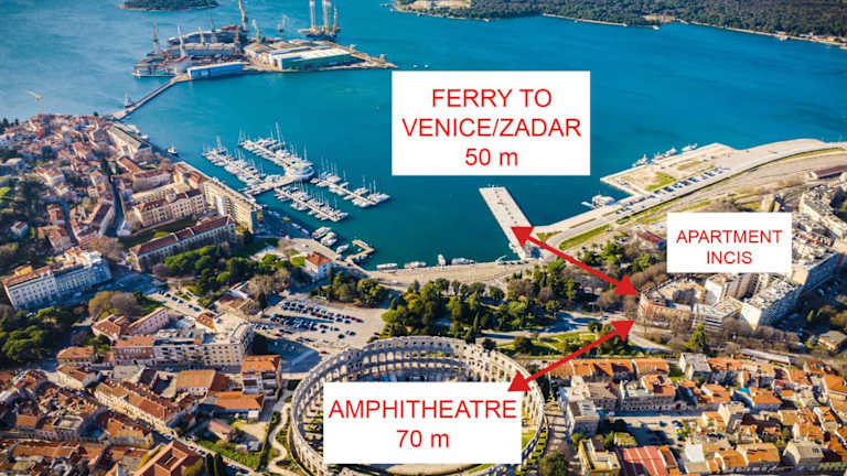 Die Unterkunft befindet sich im Zentrum von Pula, lediglich 200 m vom Amphitheater Pula entfernt. Weitere sehenswerte Punkte in der Nähe sind die Kirche der heiligen Euphemia in Rovinj, 36 km entfernt, sowie das Archaeological Museum of Istria in einer Distanz von 600 m. Der Flughafen Pula ist 5 km entfernt und der Zugang zum öffentlichen Nahverkehr ist gegeben.