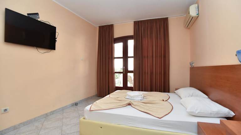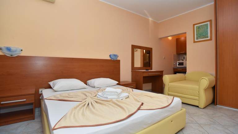 Die Zimmer im Hotel Apartments Mara sind geräumig und bieten eine private Terrasse, auf der Sie die ruhige Umgebung genießen können. Jedes Zimmer verfügt über eine Küchenzeile mit Mikrowelle, Wasserkocher und Geschirr. Zur Ausstattung gehören auch eine Klimaanlage und Kabel-TV. Bettwäsche und Handtücher werden gestellt, um Ihnen einen angenehmen Aufenthalt zu ermöglichen.
