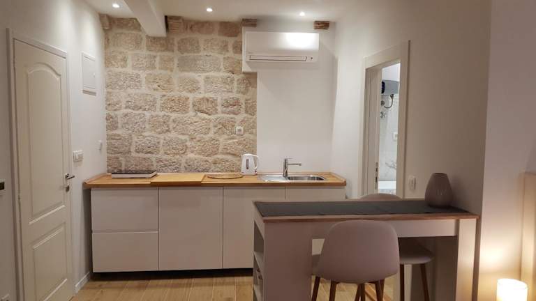 Die Apartments Milion befinden sich in der Altstadt von Korčula, in der Nähe der beeindruckenden Markuskathedrale und nur 50 m vom Strand entfernt. Die Lage ermöglicht es Ihnen, die charmante Atmosphäre der Altstadt zu genießen und in wenigen Schritten verschiedene Restaurants und Bars zu erreichen. Ein Lebensmittelgeschäft und eine Bäckerei befinden sich ebenfalls in der Nähe. Die Altstadt von Korčula bietet zahlreiche Sehenswürdigkeiten, darunter das Geburtshaus von Marco Polo. Von hier aus können Sie auch Ausflüge zu den umliegenden Inseln unternehmen, wie zum Beispiel zum Nationalpark Mljet auf der gleichnamigen Insel. Der Fährhafen ist nur 50 m von den Apartments entfernt und der Busbahnhof ist 300 m entfernt.