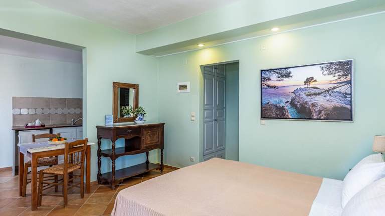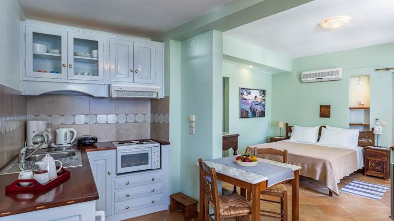 Die Unterkünfte im Hotel Stolios sind im traditionellen Stil eingerichtet und bieten einen komfortablen Aufenthalt. Alle Unterkünfte verfügen über eine Küchenzeile oder eine voll ausgestattete Küche mit einem Kühlschrank. Außerdem sind sie mit Klimaanlage, einem TV und kostenlosem WLAN ausgestattet. Die Badezimmer verfügen über eine Badewanne oder eine Dusche und einen Haartrockner.