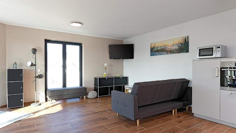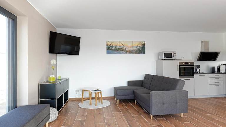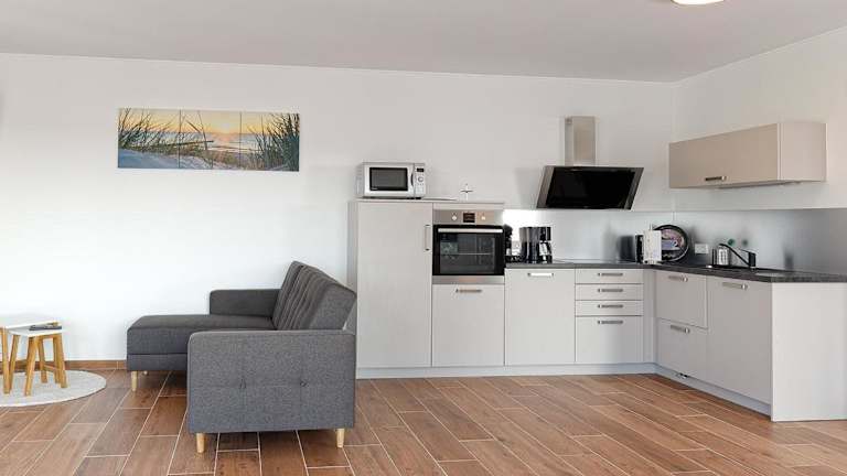 Die Apartments verfügen über eine Küchenzeile mit Kühlschrank, Geschirrspüler, Ofen, Mikrowelle, Herdplatte, Kaffeemaschine und Wasserkocher. Die Einheit bietet einen Sitzbereich und ist mit modernen Annehmlichkeiten wie Heizung und WLAN ausgestattet.