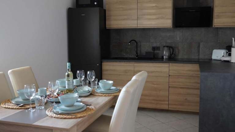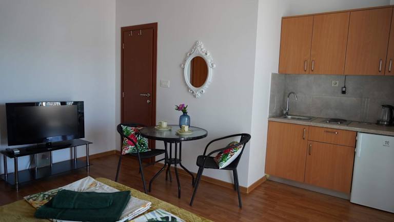 Die Wohnungen sind mit einem Flachbild-TV, einem Kleiderschrank und einer ausgestatteten Küche ausgestattet. Zur Küchenausstattung gehören ein Kühlschrank, Geschirrspüler, Mikrowelle, Kaffeemaschine und Wasserkocher. Zudem bieten die Zimmer einen Meerblick sowie eine Terrasse.