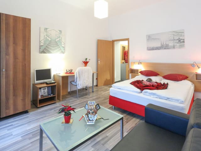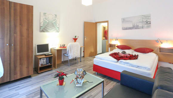 Im Namen der Mitarbeiter begrüßen wir Sie sehr herzlich im Hotel "Queens Apartments"! Genießen Sie Ihren Aufenthalt und entdecken Sie die Besonderheiten eines Appartementhotels! Besondere Eigenschaft des Appartementhotels: Es befindet sich in zentraler Lage, sodass Sie bequem die Stadt erkunden können. Das Haus verfügt über 28 Gästezimmer, davon sind 8 Doppelzimmer. Ins Internet gelangen Reisende über einen Anschluss im Hotelzimmer oder per WLAN (im öffentlichen Bereich des Hotels). Nutzen Sie die gebührenpflichtigen Stellplätze in der Garage des Hotels. Für ein extra Kinderbett oder die Bestellung eines Nichtraucherzimmers, geben Sie dies bitte bei Ihrer Buchung an. Wir werden unser Möglichstes tun, Ihrem Wunsch nachzukommen! Ein Arbeitstisch, ein Fön, ein Safe sowie ein Radio sind generell in jedem Gästezimmer verfügbar. Alle Hotelzimmer haben ein Badezimmer, sowie einen eigenen gemütlichen Balkon. Damit Sie sich wie zu Hause fühlen können! An der Bar unseres Hauses erwartet die Hotelgäste eine breite Auswahl an Getränken. Lassen Sie sich das Frühstück im "Queens Apartments" schmecken! Die Bezahlung Ihrer Hotelrechnung erledigen Sie bequem und einfach per MasterCard/EuroCard, American Express, Visa, Diners Club-Karte! Wir würden uns sehr freuen, Sie in unserem Haus willkommen zu heißen!