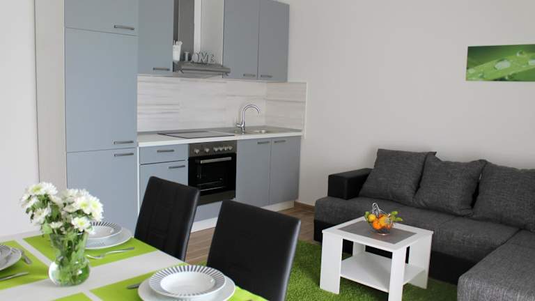 Die Apartments sind mit einer voll ausgestatteten Küche inklusive Kühlschrank, Ofen, Herdplatte, Kaffeemaschine und Wasserkocher ausgestattet, um Selbstversorger zu ermöglichen.